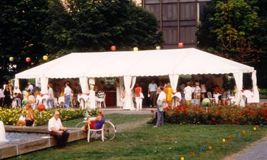 Festzeltgarnituren, Tische, Stühle, Podium und anderes. Die Nutzung des